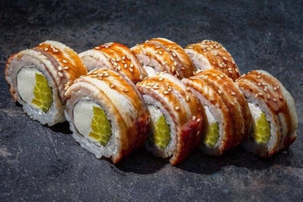 Угорь, такуан, сыр CREMETTE, рис, водоросли нори, унаги соус, кунжут.