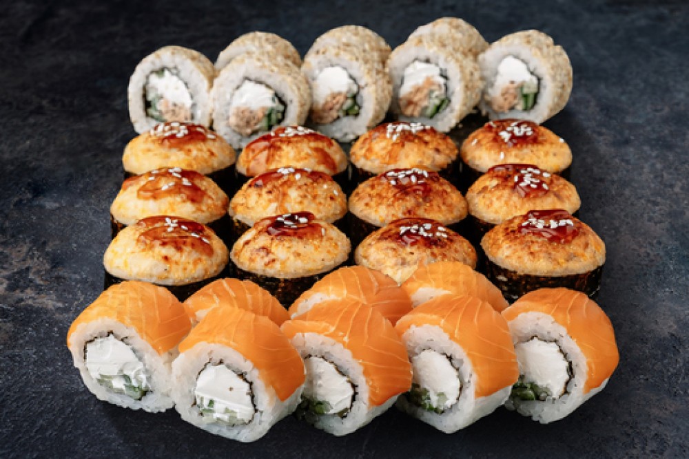 Лосось терияки маки ролл 1 шт., Филадельфия мини ролл 1 шт., Запеченный ролл с лососем и авокадо 1 шт., Запеченный ролл с курицей 1 шт.